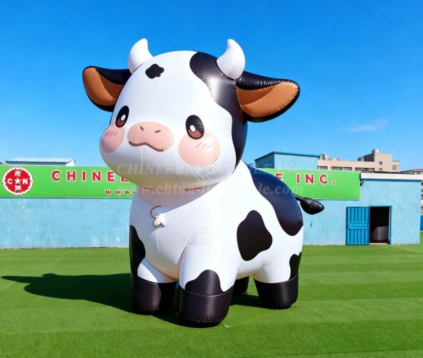 Bring charm and whimsy to your next event with this delightful Cartoon3-256 Adorable Cow Inflatable Model Product from Chinee Inflatables Inc. This oversized inflatable cow features an irresistibly cute design with classic black and white spotted markings, sweet pink cheeks, and warm brown inner ears that create an inviting and friendly appearance. Standing prominently with its cheerful expression and waving hoof, this inflatable is perfect for attracting attention and creating memorable photo opportunities.