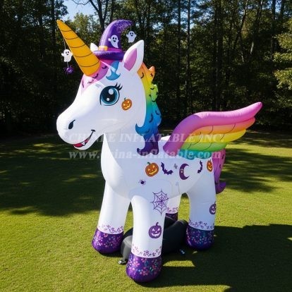 Bring spellbinding charm to your seasonal displays with the Cartoon3-342 Halloween Unicorn Inflatable Cartoons by Chinee Inflatables Inc. This eye‑catching decorative inflatable features a friendly unicorn with rainbow mane and wings, a festive witch hat, and playful Halloween graphics such as pumpkins, bats, spiders, and stars. Designed as a display piece (not for bouncing), it stands tall as a photo‑worthy centerpiece for front lawns, school fairs, shopping centers, pumpkin patches, and themed events.