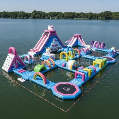 Make a splash with the S290 Hello Kitty Unicorn Water Park from Chinee Inflatables. This vibrant floating adventure park blends adorable character styling with thrilling aquatic challenges to create a must‑have attraction for lakes, reservoirs, and resort shorelines. The layout features multi‑level climbing walls, soft balance beams, crawl‑through arches, pop‑ups, splash zones, and twin high slides crowned by cute character toppers. A central floating jump pad and wide connector docks keep traffic flowing and fun continuous for mixed age groups.
