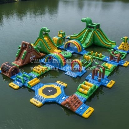 Make your waterfront the hottest destination with the S377 Dinosaur Theme Inflatable Water Park by Chinee Inflatables. This expansive floating setup combines towering dino slides, climb-and-slide volcanoes, rainbow arches, palm-tree islands, balance beams, tunnels, and a central jumping zone to create a thrilling, family-friendly aqua adventure. Guests can climb, bounce, crawl, and race across a network of interlinked modules that you can arrange to fit lakes, reservoirs, or large pools.