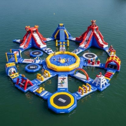 Make a splash with the S385 Floating Inflatable Water Park from Chinee Inflatables. This expansive, modular aqua arena brings slides, climbs, balance challenges, and launch pads together into one thrilling circuit—engineered for lakes, reservoirs, bays, and calm seaside venues. Bright red, blue, and yellow elements guide guests through a variety of attractions, including multi-lane climbing walls that lead to tall slides, jump platforms, trampoline-style zones, and skill sections with beams, hurdles, and step pads. A large central play area helps operators manage flow while keeping visibility high for lifeguards and staff.