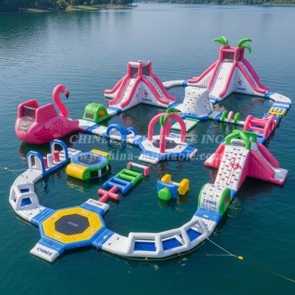 Bring vibrant tropical energy to your waterfront with the S387 Flamingo Theme Water Park by Chinee Inflatables Inc. This eye‑catching modular aqua park blends playful pink flamingo styling with a complete set of on‑water activities, creating a destination guests will talk about all season. Multiple tall slides with palm‑tree towers deliver thrilling drops into the water, while integrated climbing walls, balance logs, arches, and stepping pads provide a spectrum of challenges for kids, teens, and adults. Strategic transitions and wide walkways help traffic flow smoothly, and a floating trampoline and crawl‑through tunnels add variety for extended play.