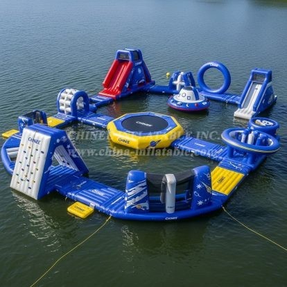Launch unforgettable summers with the S402 Space Theme Water Park from Chinee Inflatables. This modular floating playground brings an interstellar look to lakes and calm waterfronts, featuring rocket graphics, star patterns, and a UFO‑style hub that instantly attracts visitors. Multiple play stations keep traffic flowing: twin water slides, a climbing wall, balance tracks, rollers, a splash trampoline, and interactive challenge zones connected by stable walkways. It’s the perfect centerpiece for resorts, camps, marinas, and rental operators seeking a high‑capacity attraction that stands out.