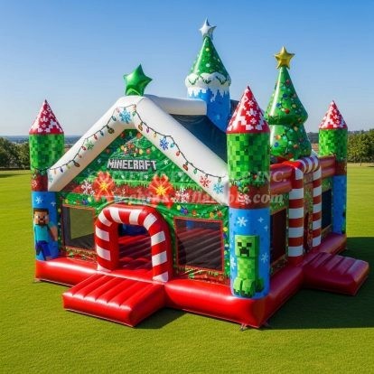 Bring festive pixel fun to your next event with the T2-8594 Minecraft Christmas Theme Inflatable Bouncer. Designed by Chinee Inflatables Inc. (established 1998), this bounce house blends iconic block-style graphics with cheerful holiday elements such as candy-cane trim, snowflake patterns, and towering Christmas trees capped with stars. The spacious jumping area encourages active play, while mesh windows provide great visibility and airflow so attendants can easily supervise kids inside.