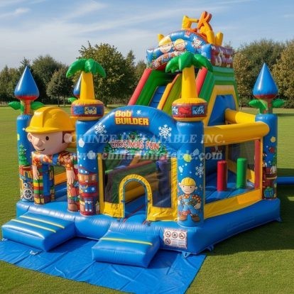Bring construction‑themed excitement to your next event with the T2-8608 Bob the Builder Inflatable Combo. Designed by Chinee Inflatables Inc., this multi-activity unit blends a spacious bouncing area with an integrated climb-and-slide for nonstop play. Kids enter through the cheerful archway and are greeted by bright, wintery artwork and a friendly builder figure that sets the scene for imaginative adventures. Inside, the mesh-paneled bounce zone keeps participants visible and well-ventilated while soft inflatable posts add playful obstacles. A wide, easy-access climb leads to the tall slide, finished with protective bumpers and a gentle landing for smooth, safe rides.