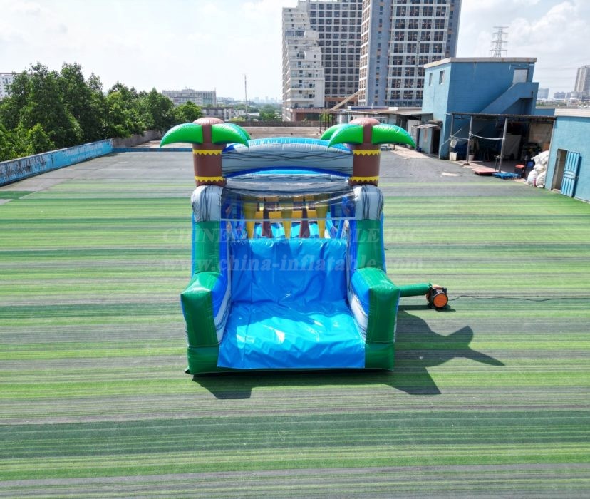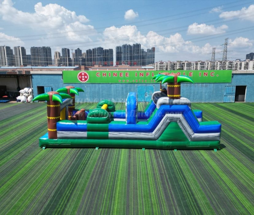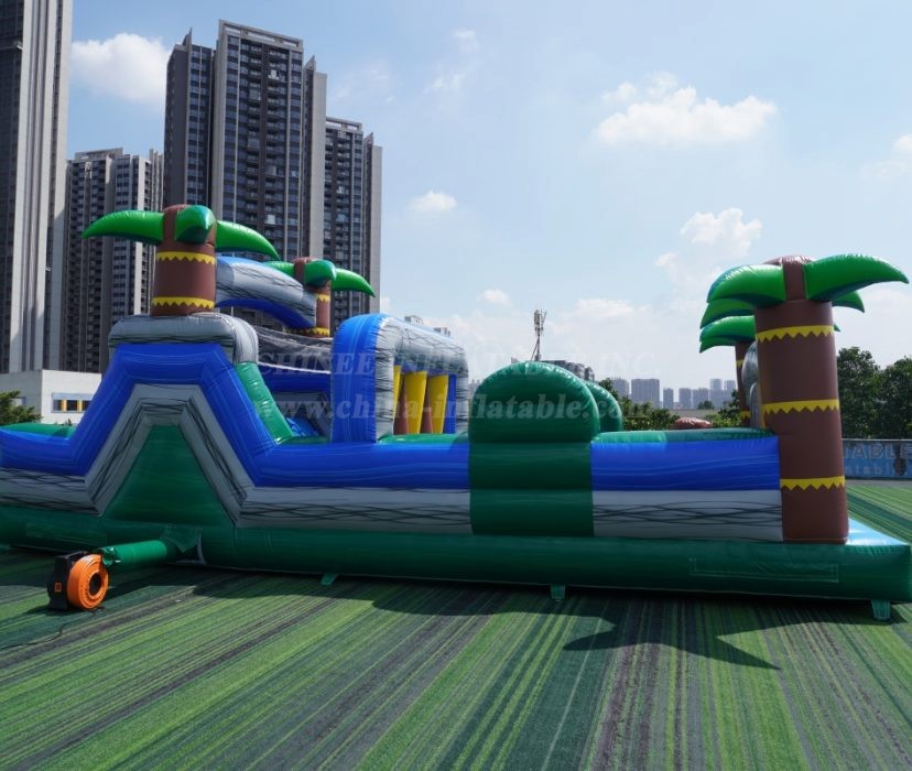 Participants will start their jungle expedition by diving through tunnels, pushing past vertical pop-ups, navigating horizontal hurdles, and scrambling up the final challenge to see who finishes first. The vibrant green, blue, and grey design, topped with towering inflatable palm trees, creates a visually stunning centerpiece for any party or event.