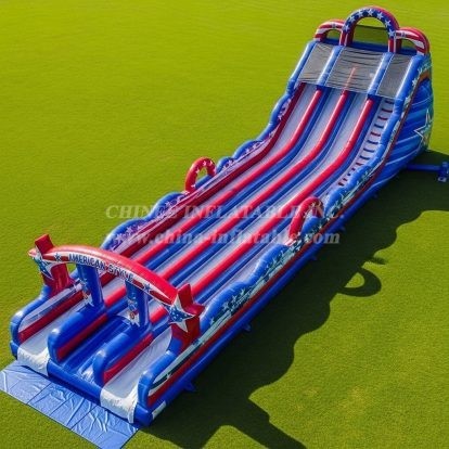 The T8-8810 American Style Inflatable Dry Slide delivers high-energy fun with its bold red, white, and blue star-spangled design. Perfect for large events, fairs, or community celebrations, this giant dry slide offers multiple lanes for racing excitement. Built by Chinee Inflatables with top-quality materials, it ensures durability, safety, and hours of entertainment. Its patriotic look is sure to stand out and attract crowds, making it an excellent centerpiece for any gathering.