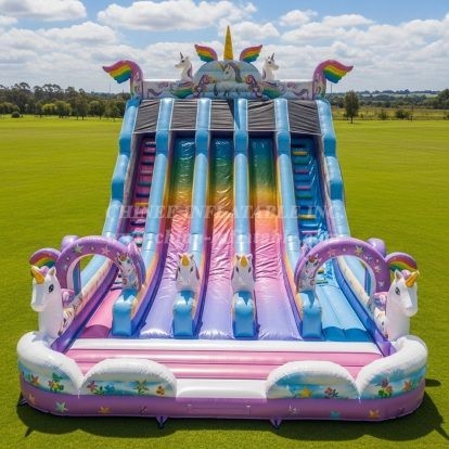 Bring magical fun to any event with the T8-8815 Unicorn Inflatable Slide from Chinee Inflatables. Featuring a vibrant rainbow gradient and adorable unicorn designs, this eye-catching slide captivates kids and adults alike. Its large multi-lane structure allows several riders to enjoy at once, making it perfect for themed parties, fairs, and family fun days. Durable, safe, and beautifully crafted—ideal for creating unforgettable outdoor adventures.