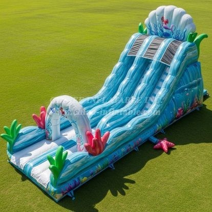 Experience endless aquatic fun with the T8-9050 Mermaid Inflatable Water Slide. Featuring vibrant ocean-themed decor including mermaids and coral reefs, this dual-lane water slide offers thrilling splashes for kids and adults alike. Its durable construction and engaging design make it perfect for backyard parties, water parks, or any summer event seeking a splash of magic and excitement.