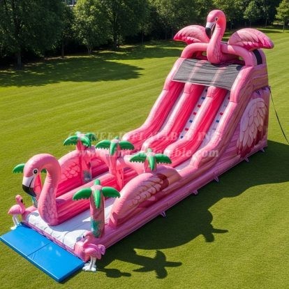 Experience sunny fun with this vibrant Flamingo Inflatable Water Slide! Featuring bright pink flamingos and lush tropical palm trees, it brings a festive tropical vibe to any outdoor event Perfect for cooling off and sliding into excitement, this attractive water slide adds both style and joyful entertainment to your party or fun park.