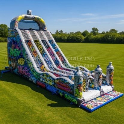 bold and colorful Graffiti Inflatable Slide brings urban street art style to outdoor fun. Featuring vivid spray paint-inspired graphics and towering slide lanes it’s perfect for thrilling sliding excitement at events or parks. Durable and eye-catching, this inflatable slide guarantees endless active play with edgy artistic vibe.