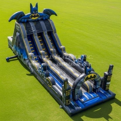 thrilling fun with this Batman-themed inflatable water slide. Featuring iconic Batman logos and cityscape graphics, this durable slide offers fast-paced excitement for kids and adults. Perfect for outdoor events and parties, it brings superhero style and wet adventure together for endless entertainment.